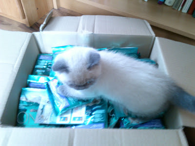 Die Mihoko erhielt vor zwei Wochen ein großes Produkttester-Paket Purina One Coat und Hairbal. Schon beim Öffnen des Kartons war sie sehr neugierig und konnte es nicht abwarten in den Karton zu springen. Sie ist noch jung und sehr verspielt und liebt es sich in Kartons zu verstecken.